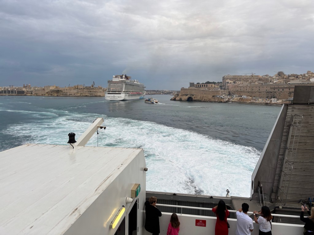 Our time in Malta had come to an end, and we set our sights on Sicily. Our voyage began with a 5 a.m. Bolt ride to the Virtu ferry terminal in Valletta, where we boarded a catamaran for a relatively quick one-hour and 45-minute trip across the Mediterranean. The boat was surprisingly comfortable, and we discovered we had upgraded tickets to Club Class, which offered comfortable seats, plenty of coffee and snacks, and access to an aft observation deck where we could watch our departure from Valletta. We left Malta just as the sun rose in the east, gliding north thru the water toward Sicily, beyond the horizon.