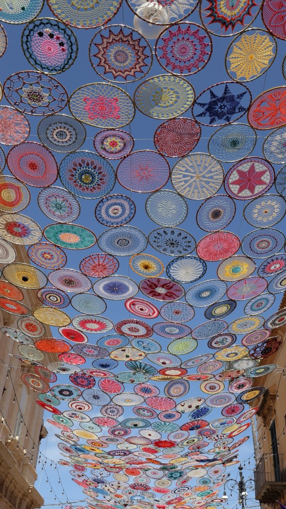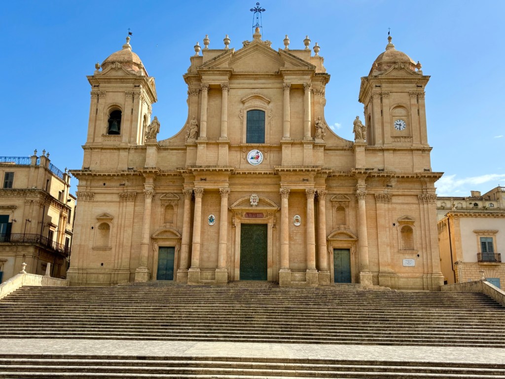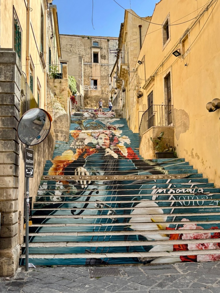 Our first stop was Noto, the Golden City, and fortune smiled on us as we arrived with ample time to explore just before the busloads of tourists descended. Known for its baroque architecture and honey-colored stone, similar to that of Malta, Noto felt like stepping into a picturesque late 16th century painting of a small Sicilian hillside town. We strolled through the town, taking in the grandeur of Noto Cathedral. The town was just waking up, with shopkeepers sweeping walkways, pulling shades, and opening their doors for business. Taking advantage of the absence of crowds, we became the first customers of the day, purchasing a tablecloth, some souvenirs, and a bottle of Limoncello (as lemons are something Noto is well known for). It turned out that the Infiorata di Noto 2025 (the Noto Flower Festival) was taking place with colorful displays in the street made with flower petals from spring blossoms. For a brief moment, it felt like we had Noto all to ourselves.