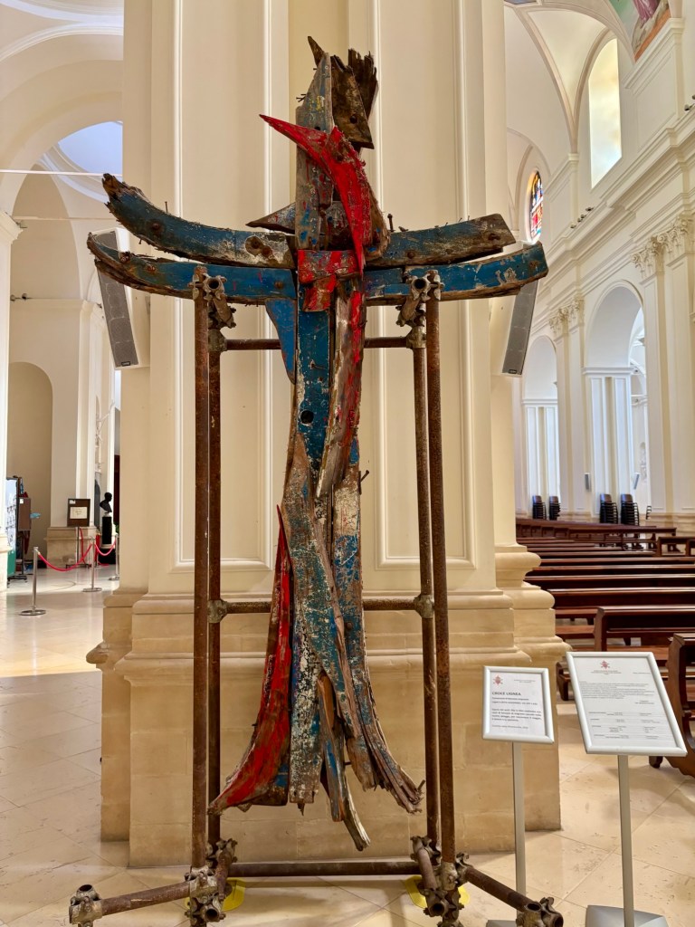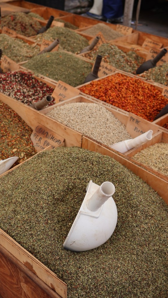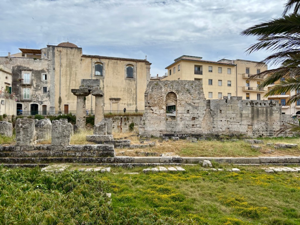 We spent the afternoon weaving through Ortigia’s narrow alleyways, discovering hidden courtyards, ancient ruins, and shops selling spices or local crafts. Since we had a guided tour scheduled for the following day, we decided not to visit too many official sites, opting instead to simply wander and explore. We did, however, come across the simple church of Chiesa di San Filippo Apostolo, and wandered down a narrowing dead-end alley lined with “pay what you want” art displayed on the walls. There, we also encountered a beautiful-eyed cat greeting us to purchase.