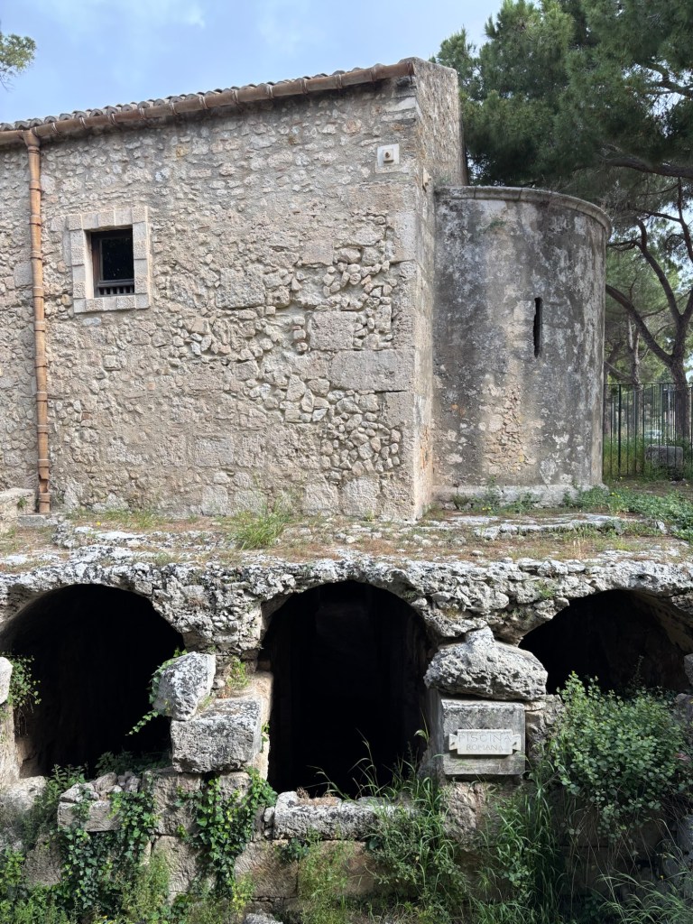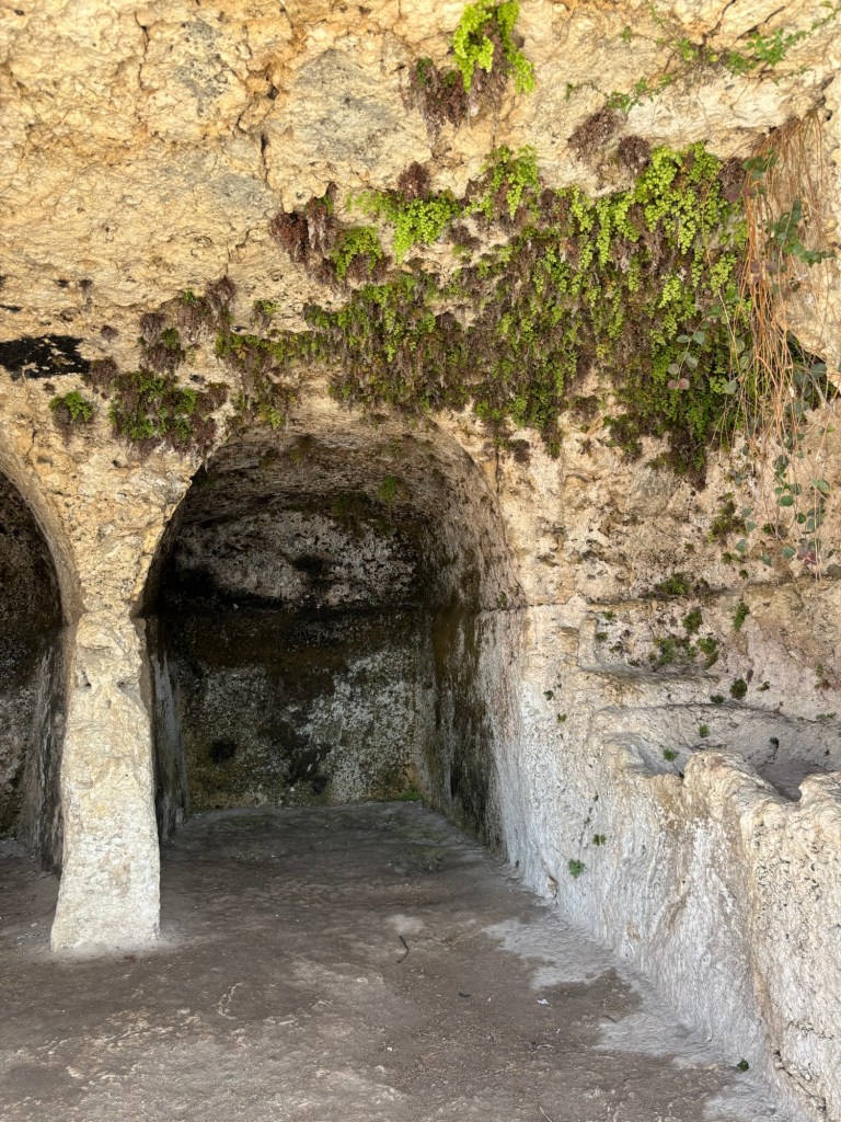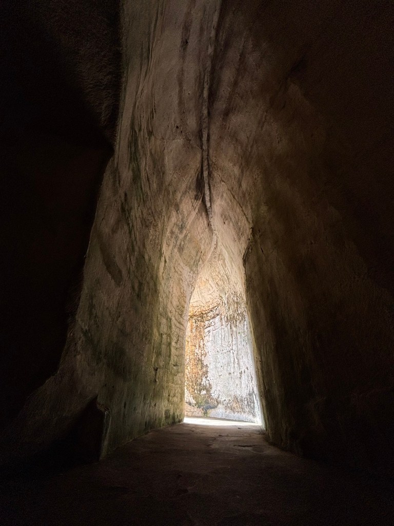 From the quarry, we continued to one of Syracuse’s most intriguing landmarks: the Ear of Dionysius. Apparently the name was given it by Caravaggio (who we planned to see in Rome) in 1608. This slender, arch-shaped cave, carved into the rock face of the old stone quarries, has a legend tied to it. According to our guide, Dionysius the Tyrant used this echoing cavern as a prison for his enemies, exploiting its perfect acoustics to eavesdrop on whispered conspiracies. The cave’s unique shape amplifies sound, making even the quietest whispers resonate. We stepped inside and tested the echo for ourselves, amazed by the cave’s eerie ability to magnify even the subtlest of sounds, such as bird wings flapping or pigeons eerily cooing while flying in and out of the cave.