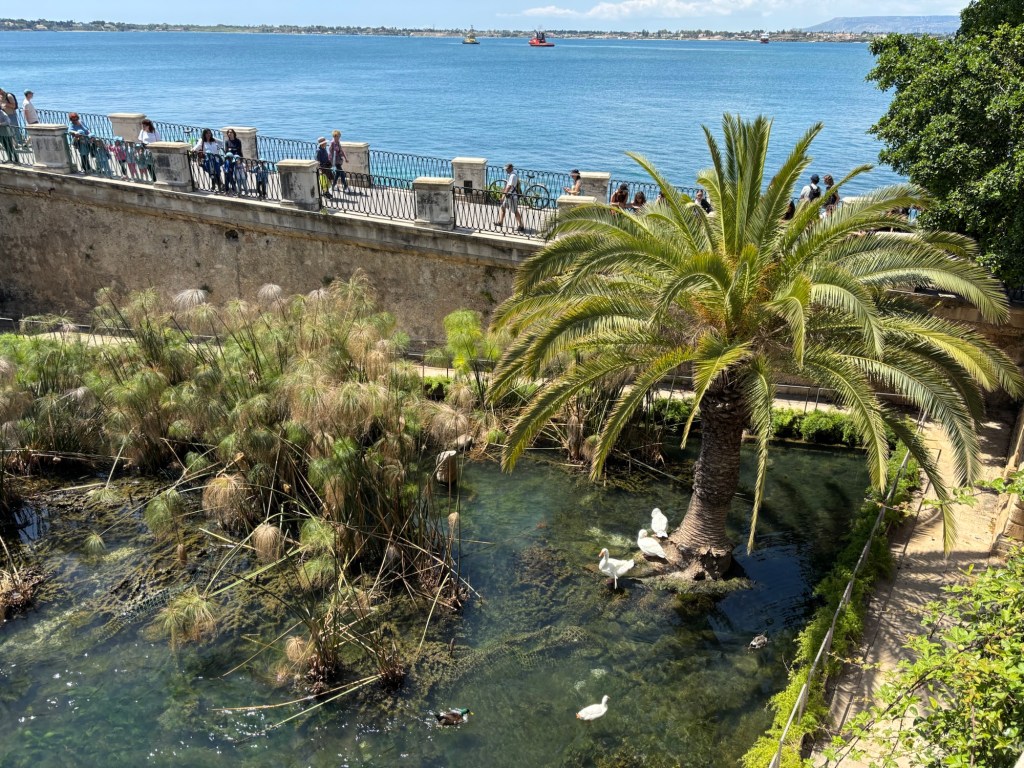 With the morning’s ancient history lesson behind us, we crossed the bridge back to Ortigia, the historic heart of Syracuse. The island has a history of Greek, Roman, and Norman influences, with understated Baroque architecture. Wandering again through narrow alleys, we felt the layers of history beneath our feet and now had a guide to tell us more about what we had seen yesterday.