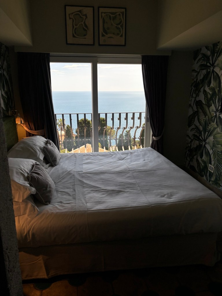 As we approached Taormina, the road twisted and turned, each switchback more dramatic, dizzying, and awe-inspiring than the last. Below us lay Isola Bella, a rocky island connected to the beach by a narrow ribbon of sand, accessible only by wading through a bit of water and heavily featured as an ominous visual element of White Lotus Season 2. Our twisting and turning ascent up the road to Taormina seemed endless, until suddenly, voilà! We arrived at Hotel Villa Carlotta. Our charming boutique hotel, carved into the hillside, offered sweeping views of mega yachts and cruise ships anchored in the vivid blue waters far below. Although it wasn’t the Four Seasons San Domenico Palace of White Lotus fame, it was just down the street and certainly the next best thing. You half expected to see Jennifer Coolidge as Tanya McQuoid-Hunt imagining herself to be Monica Viti whipping by on a turquoise Vespa.