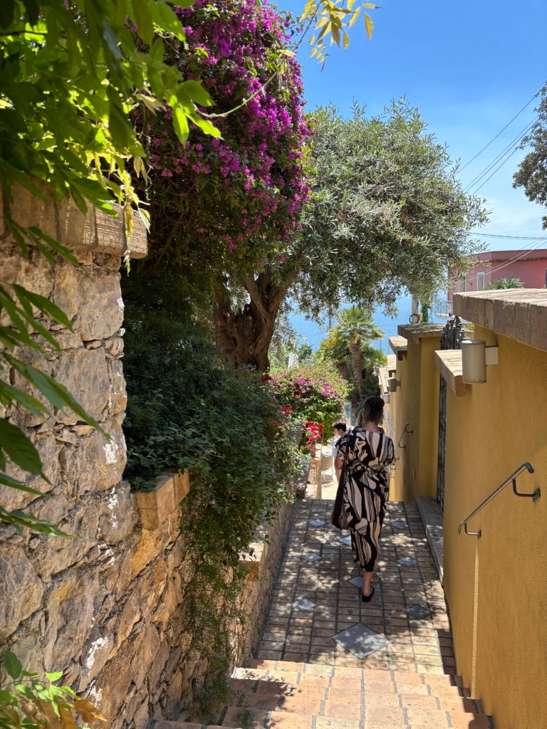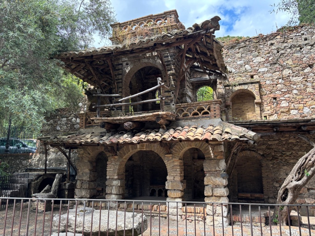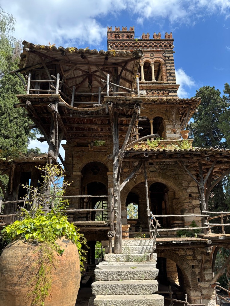 Our first stop was the Villa Comunale, a lushly green, terraced garden just a few steps from our hotel. Originally the private garden of Lady Florence Trevelyan, an English noblewoman who settled in Taormina in the late 19th century, it has since been transformed into a public park. Lady Trevelyan, known for her love of nature and birds, designed the garden as a sanctuary for people and bird alike. What we thought were the remains of quirky homes she had built there were actually ornamental birdhouses, originally intended to attract and shelter various bird species! It was a serene and enchanting surprise to find this unique park next to our hotel.