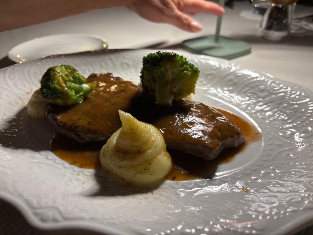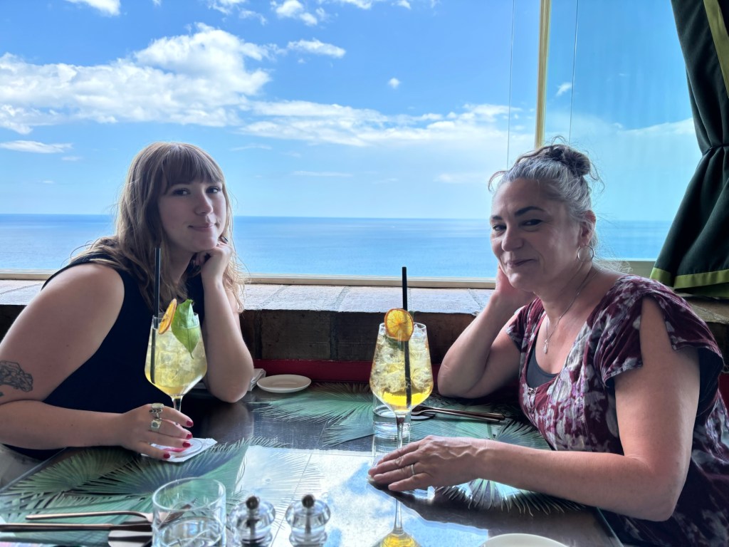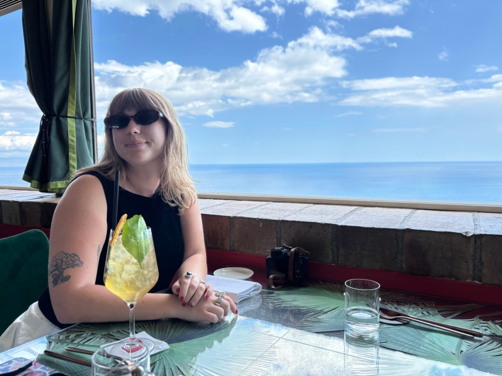 After settling into our room with its postcard-perfect view, we took a short break by the pool while waiting for the hotel restaurant to open for lunch. Once it was time, we made our way to the hotel’s top-floor restaurant. The panoramic view was utterly mesmerizing, like an infinity pool for the eyes, where our cocktails on the table seemed to blend into the endless blue of the sea and sky. The food and wine were excellent, setting the perfect tone for our time in Taormina.