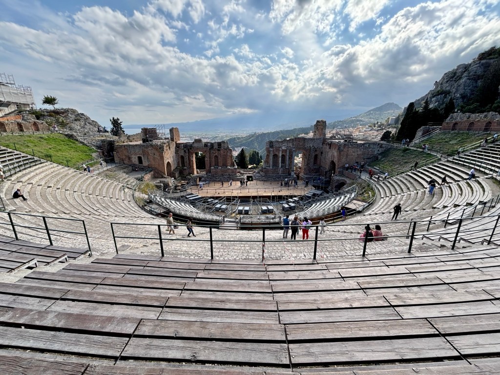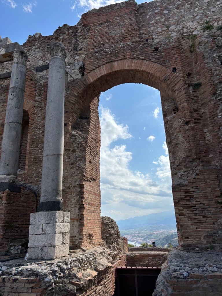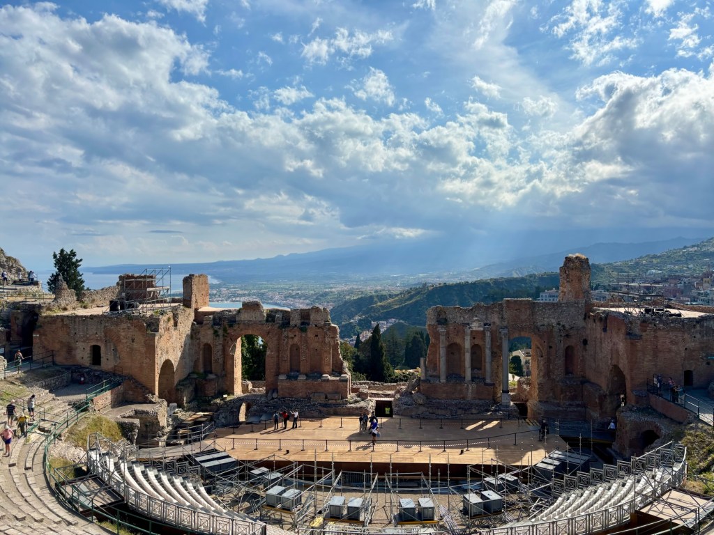From there, we meandered through Taormina’s historic center, our guide pointing out restaurants tucked into the folds of narrow streets and charming shops brimming with local food and crafts. We climbed steps towards the crown jewel of the town: Teatro Antico di Taormina. Perched on a hill high above Taormina, the ancient Greco-Roman amphitheater commanded views that stretched from the rugged coast to the distant silhouette of Mt. Etna. It was similar (but smaller) than the Greek Theater in Syracuse.
