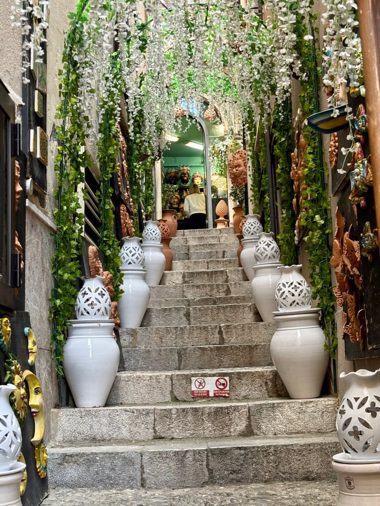 We set out in the afternoon with our private guide, eager to explore Taormina’s historic charm. The cliff-side town itself is a captivating maze of elegant squares, winding alleyways, and steep staircases lined with cozy cafés, bars, and osterias that spilled into the stairs and streets. As we wandered, it was easy to see why Taormina’s irresistible blend of old-world beauty and cinematic scenery made it the perfect setting for The White Lotus.