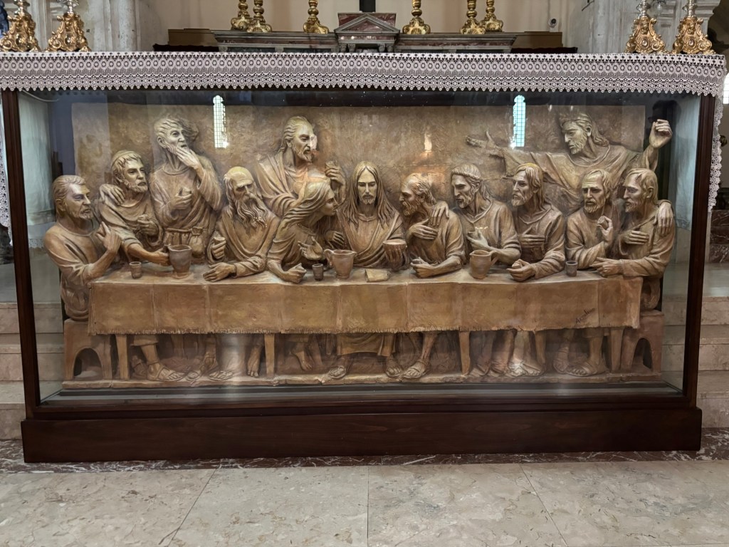 Our last stop was the modest Cathedral of Taormina, where a newly commissioned wooden carving of the Last Supper, created for Jubilee 2025, featured a clear depiction of Mary Magdalene to the right of Jesus, a progressive inclusion that sparked thoughtful reflection. And yet, just steps away, the Dolce & Gabbana Mocambo Bar made a striking contrast between luxury fashion and this thousand-year-old monument. In any other place, this contrast might have seemed out of place, but in Taormina, it somehow felt fitting.