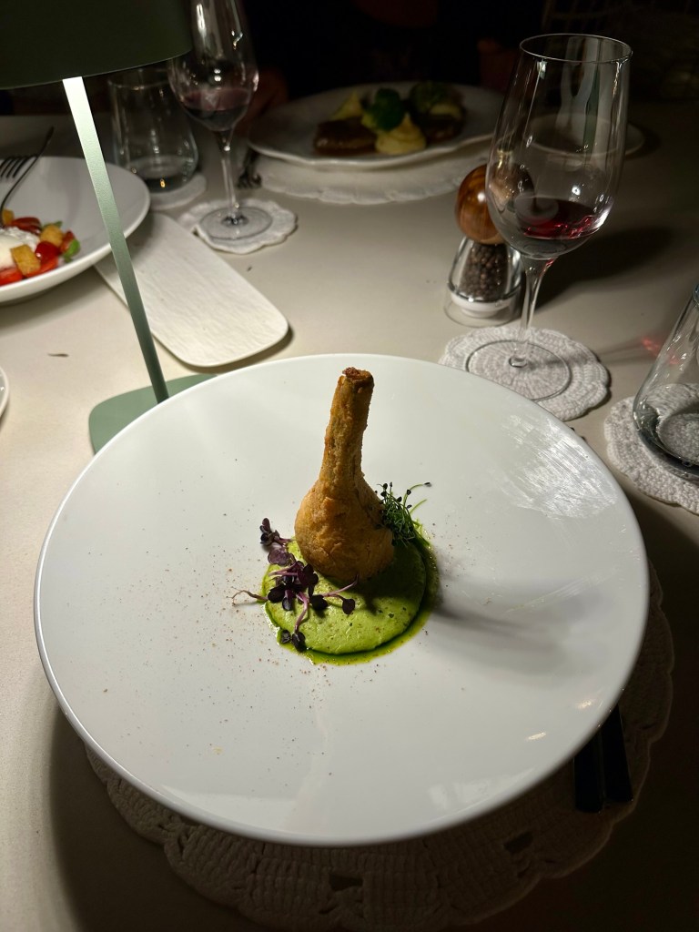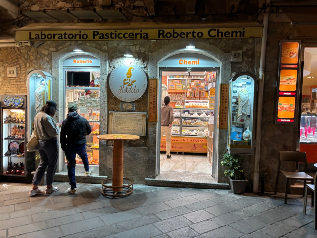 Hunger soon called again, and we opted for I Giardini Di Babilonia Ristorante Bistrot, a charming spot with a courtyard framed by a blooming canopy of trees. Unfortunately, the atmosphere proved more satisfying than the meal itself after an absurdly sized €20 entrée got delivered with slightly indifferent service. Still, it couldn’t dampen our spirits and we laughed it off. But still hungry we wandered back down the Corso Umberto in search of cannoli and found some at Roberto Chemi, a famous stop for the crunchy pastry with sweet creamy ricotta and there was marzipan as well!