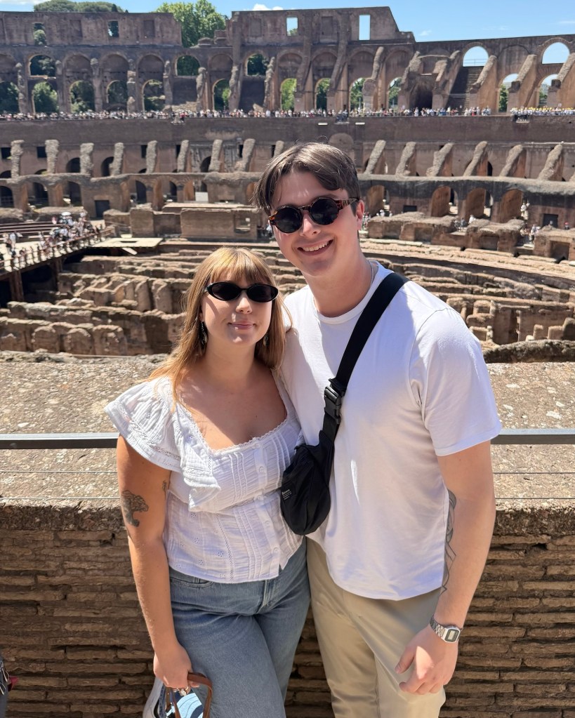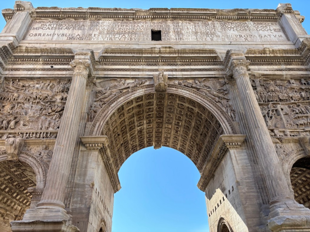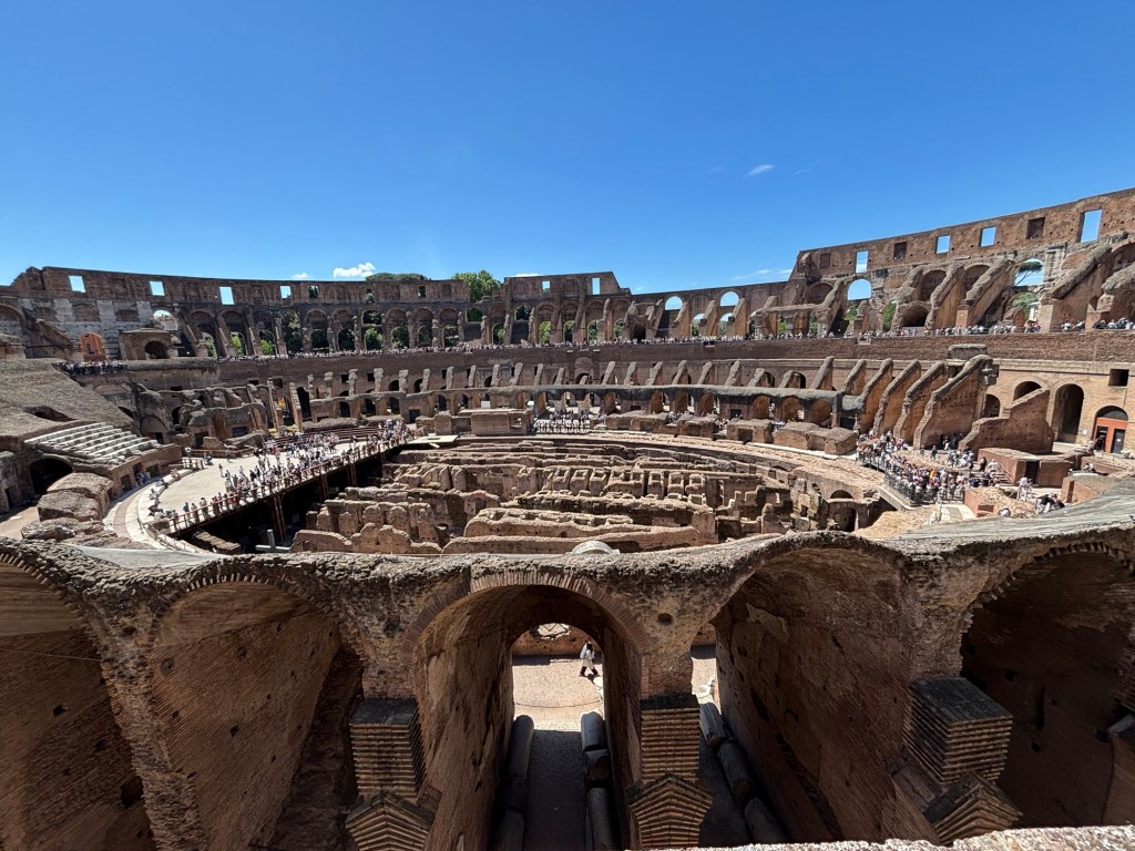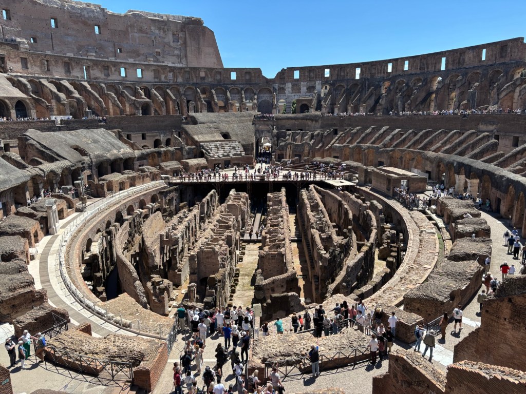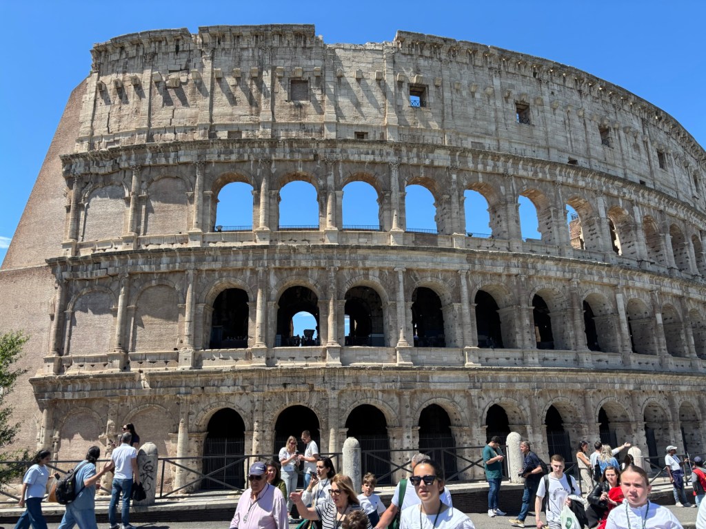 Just up and over the hill, down the Via Sacra, the Colosseum awaited. We had been before, but it is one thing to visit a site of history and quite another to be guided through its story. With our questions poised and answered, we explored the layers of history within this awe-inspiring UNESCO site. I had just watched Gladiator II on the flight over to get excited for our Colosseum encounter, but nothing compares to stepping onto the Colosseum’s edge and imagining the roar of 80,000 spectators, pining for spectacle, while emperors gave them “panem et circenses” (bread and circuses) to keep their population pacified (tickets to the Colosseum were free to citizens and slaves alike). The crowd was thick and heavy, a mass of tourists, no doubt heightened by the Jubilee year and the transition within the papacy.