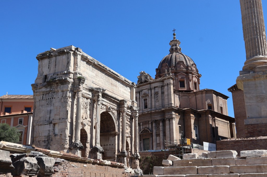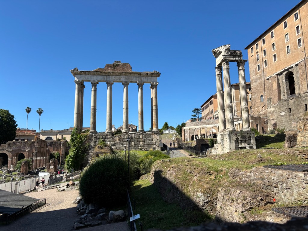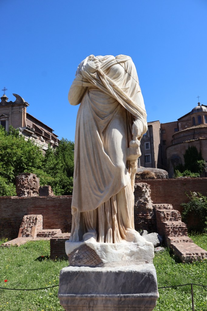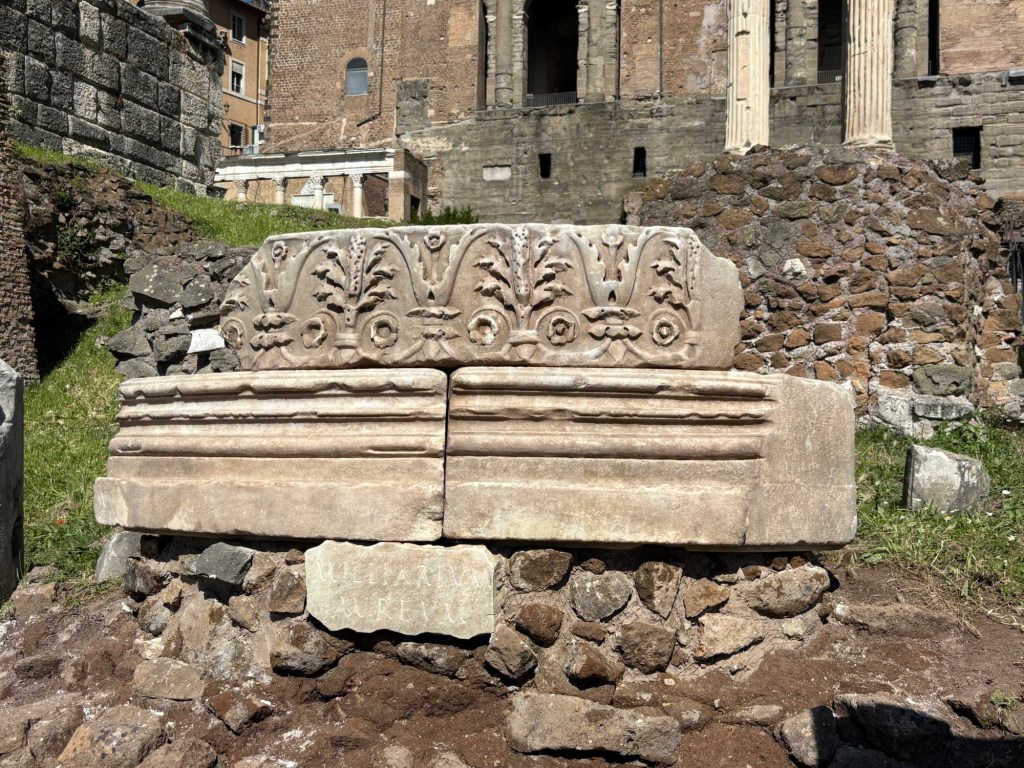 Our guide knew a little-used entrance to the Roman Forum, so we got in quickly and early before the crowds. The Forum unfolded before us like the Appian Way, nestled in the valley framed by three of Rome’s legendary seven hills: Palatine, Quirinale, and Capitolium. With our guide’s narration, the ruins rose from remnants to their former glory. We strolled past the pulpit where Mark Antony once spoke over Caesar’s lifeless body, saw the modest ruins marking Caesar’s burial site, the House of the Vestal Virgins (dutiful in keeping Vesta’s sacred fires lit and remaining chaste, lest they be buried alive!) and the Miliarium Aureum, from which all distances in the Roman Empire were once measured, making it the center of the world.