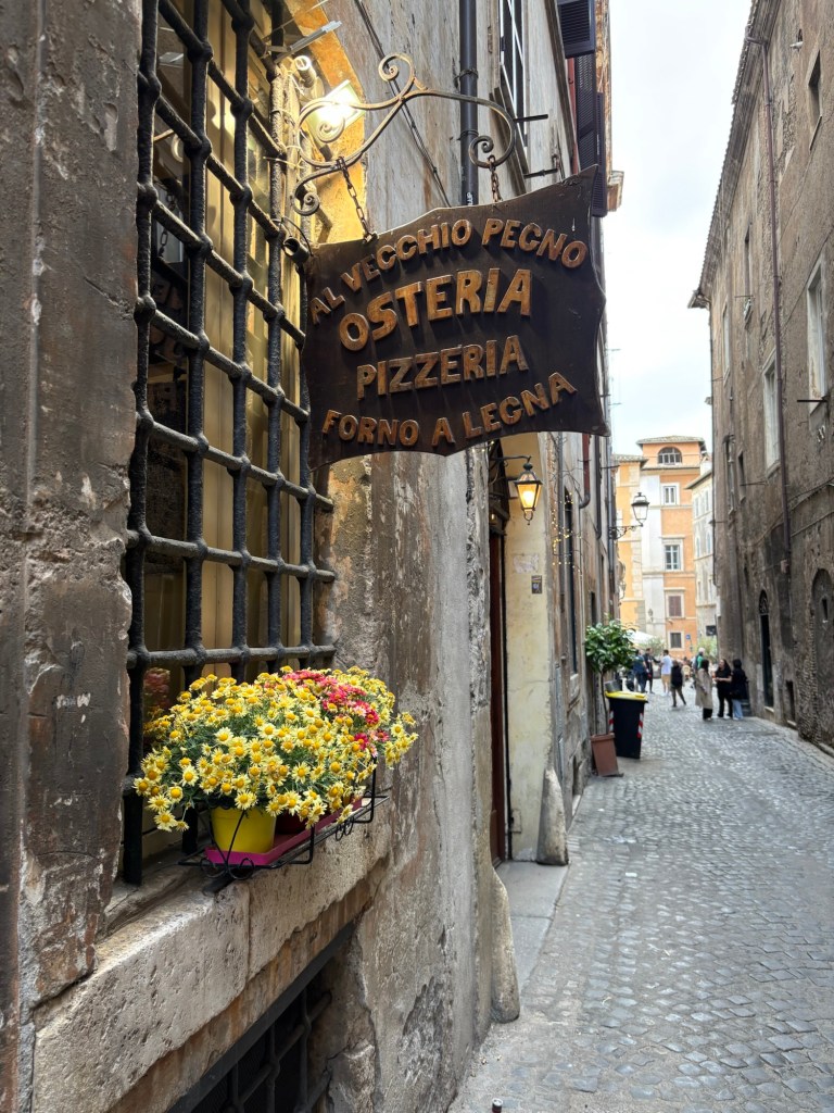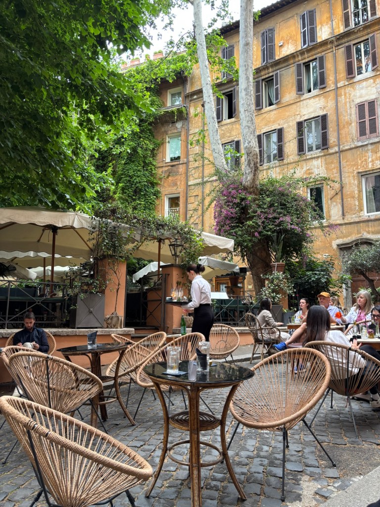Stuffed with food and memories, both new and old, we set off on foot from Piazza Navona, dragging a newly purchased suitcase I had picked up after dinner (a necessity thanks to our souvenir spree) past the Trevi Fountain. Tonight, the iconic monument pulsed with light from a full-blown laser show and thumping party music, part Jubilee, part disco, and seemingly sponsored by the 2025 Italian Open, which was taking place during our visit. We elbowed our way through the crowd, coins in hand, ready to toss them into the fountain to guarantee our return to Rome one day. One may have bounced off the fountain, another off someone’s head, but ultimately, we secured our prophetic return.