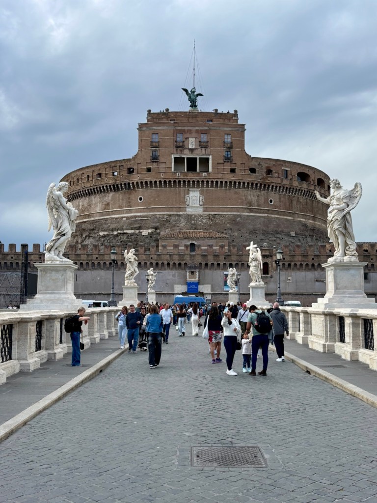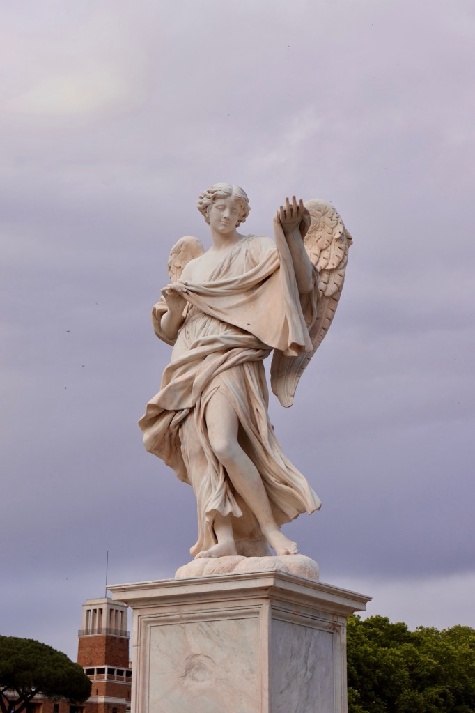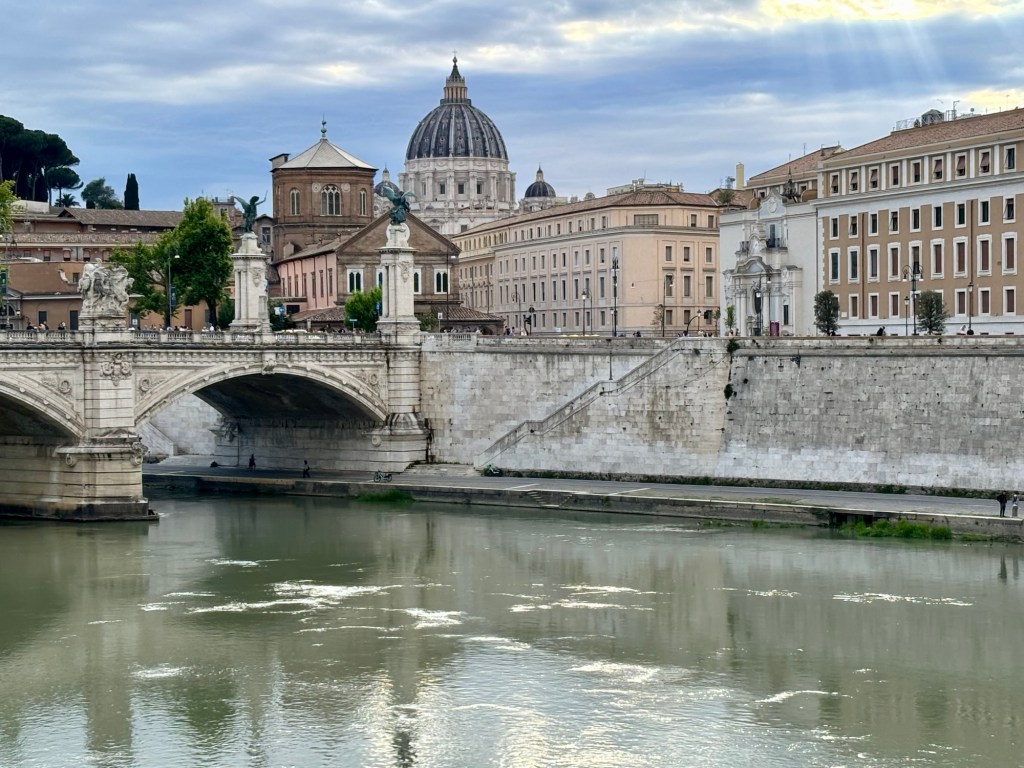 As evening approached, we wandered to Castel Sant’Angelo. Rays of “Jesus light” like angelic spotlights came through the clouds on St. Peter’s Basilica and the golden light reflected off the Tiber, and onto the fortress and bridge of statues. It was a beautiful evening.