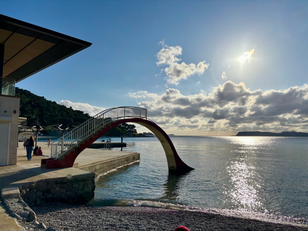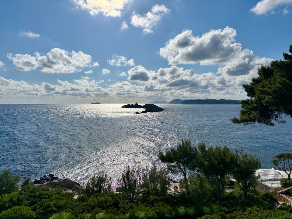 Our driver and our guide for tomorrow met us at the airport and whisked us north, past Dubrovnik’s famous fortress walls, toward our seaside refuge: the Hotel Dubrovnik Palace. Elegant, perched above the cliffs, with sweeping views of the Adriatic Sea that made us exhale and immediately relax.