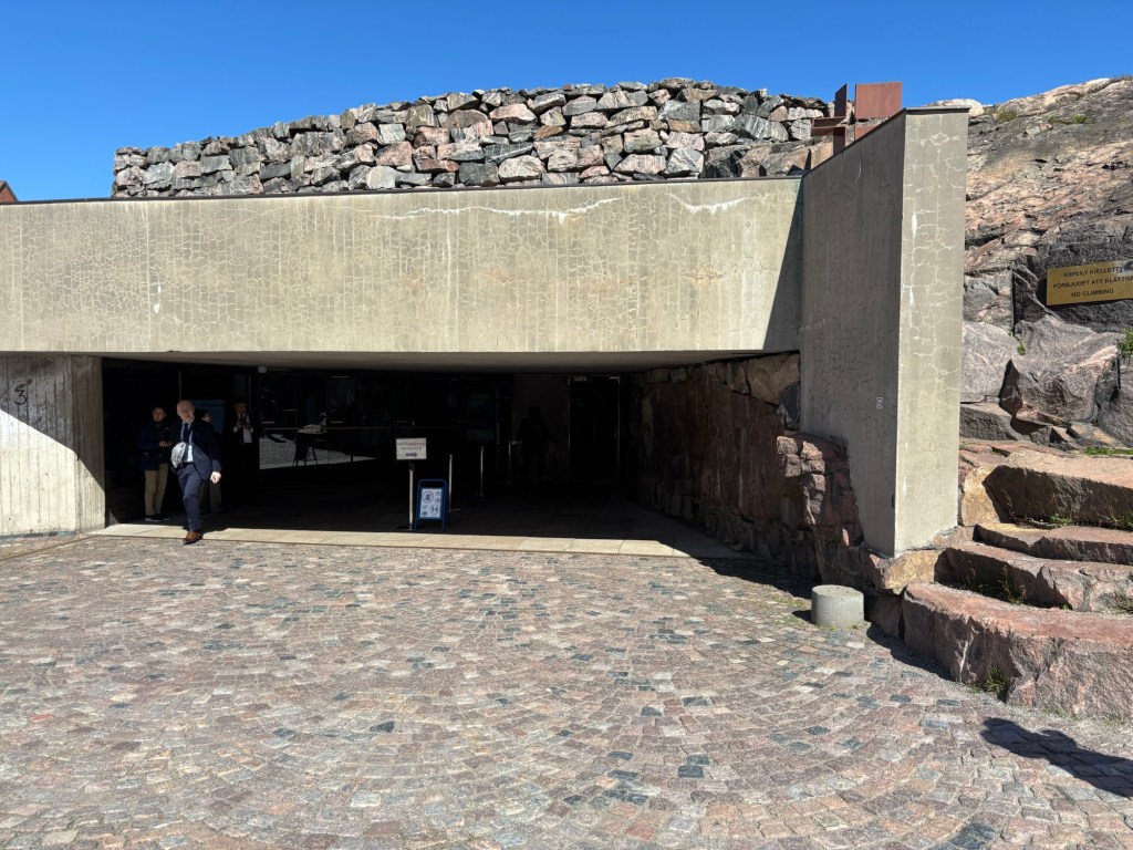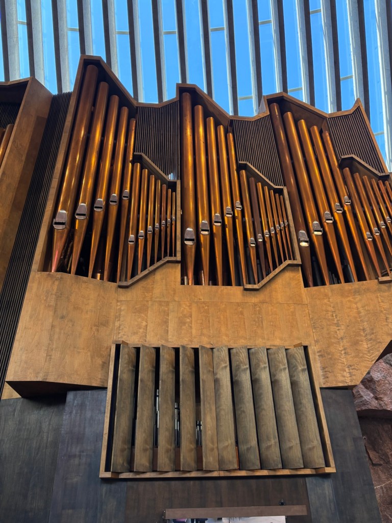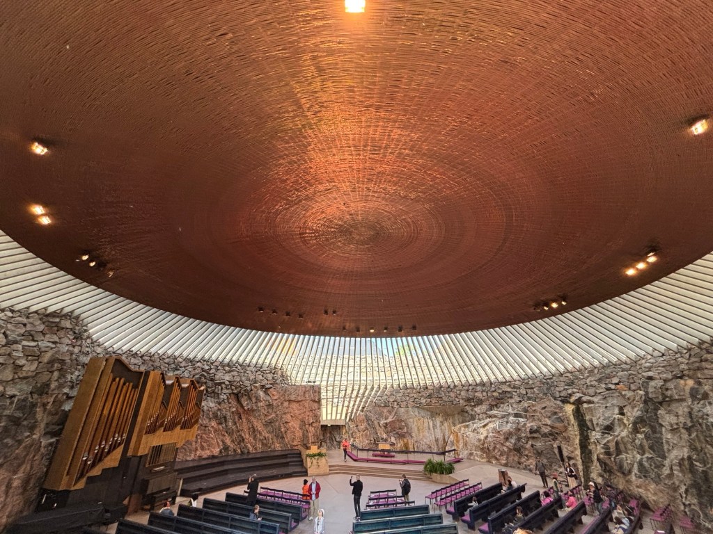 We began our morning at Temppeliaukio Church, better known as the Rock Church, a marvel of 1960s modernism built directly into solid bedrock. Designed by architects Timo and Tuomo Suomalainen and completed in 1969, this Lutheran church feels like a juxtaposition between ancient cave and mid-century chapel. Morning sunlight poured in through the windows, reflecting off the copper-domed ceiling and the massive copper pipes of the pipe organ.