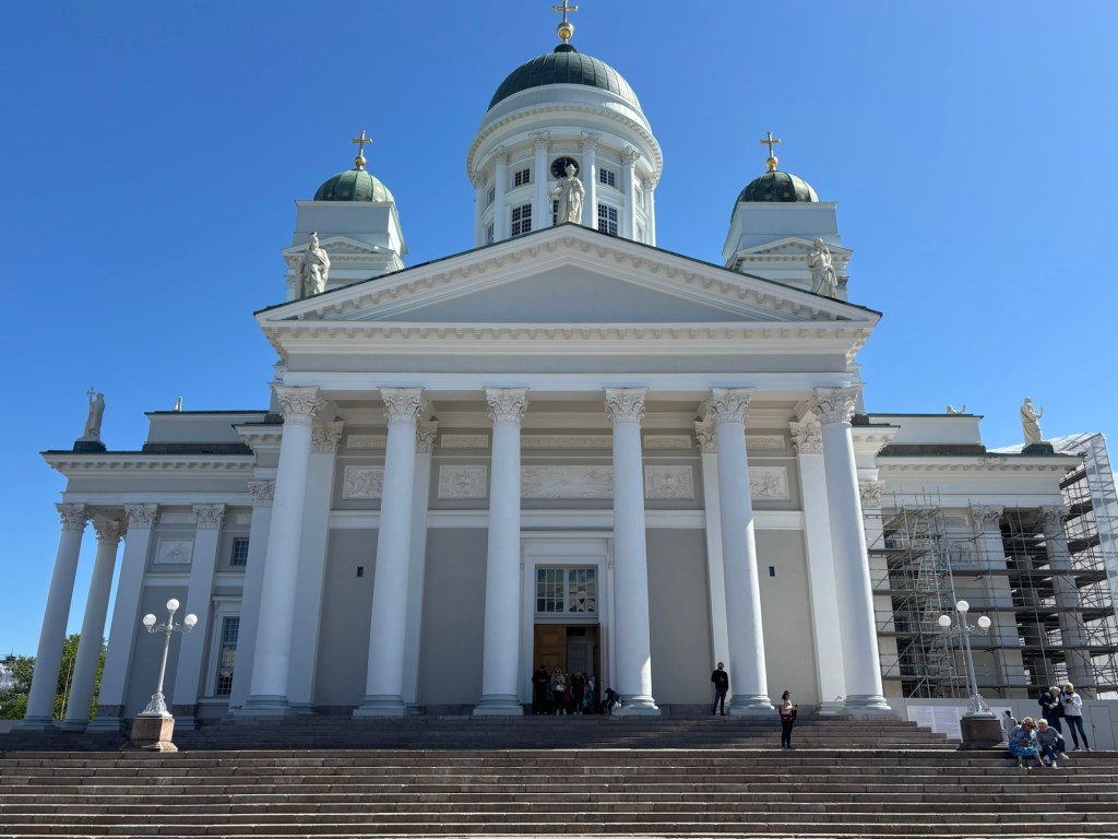 From Temppeliaukio, we walked down the gently sloping streets of central Helsinki toward the brilliant white Helsinki Cathedral, a neoclassical landmark that dominates the skyline above Senate Square. Completed in 1852, this Evangelical Lutheran cathedral was originally built as a tribute to Tsar Nicholas I of Russia. Its soaring green dome and the twelve apostles standing guard on the roof gave it a mighty presence. Inside, however, the space is nearly bare and austere, with little of note to photograph.