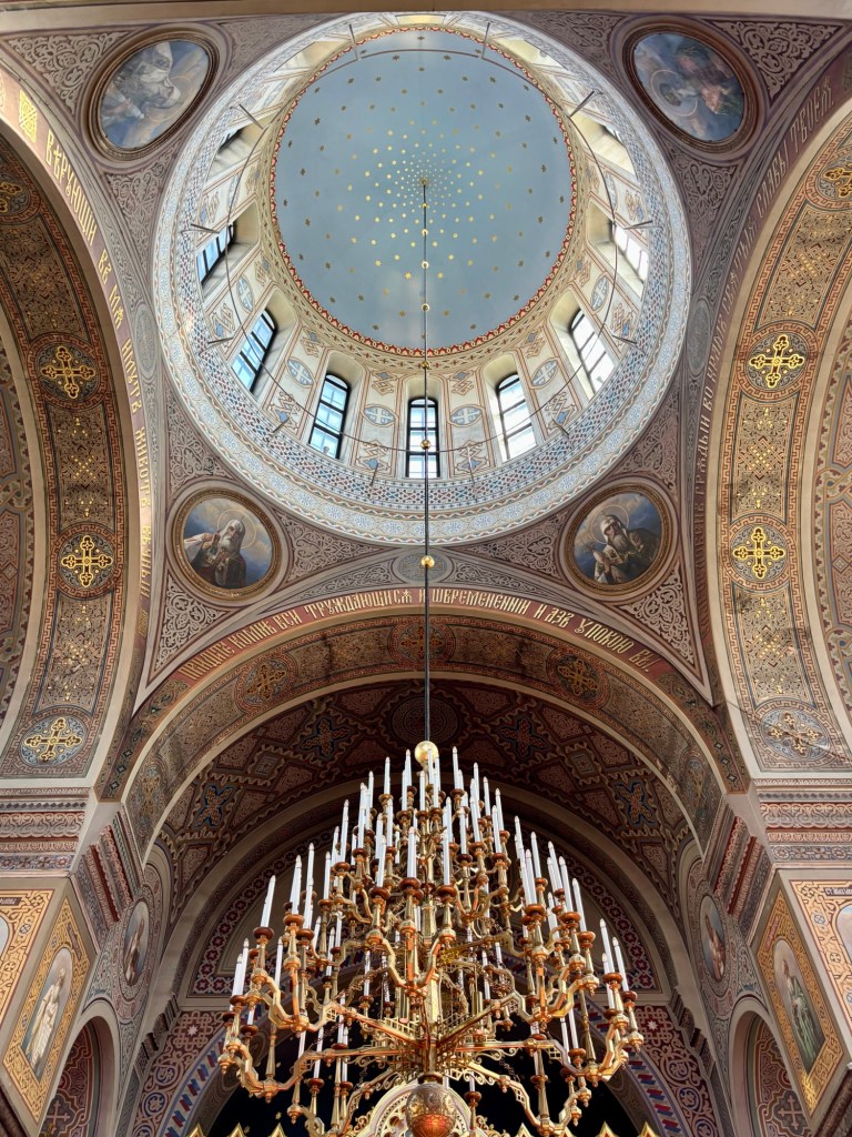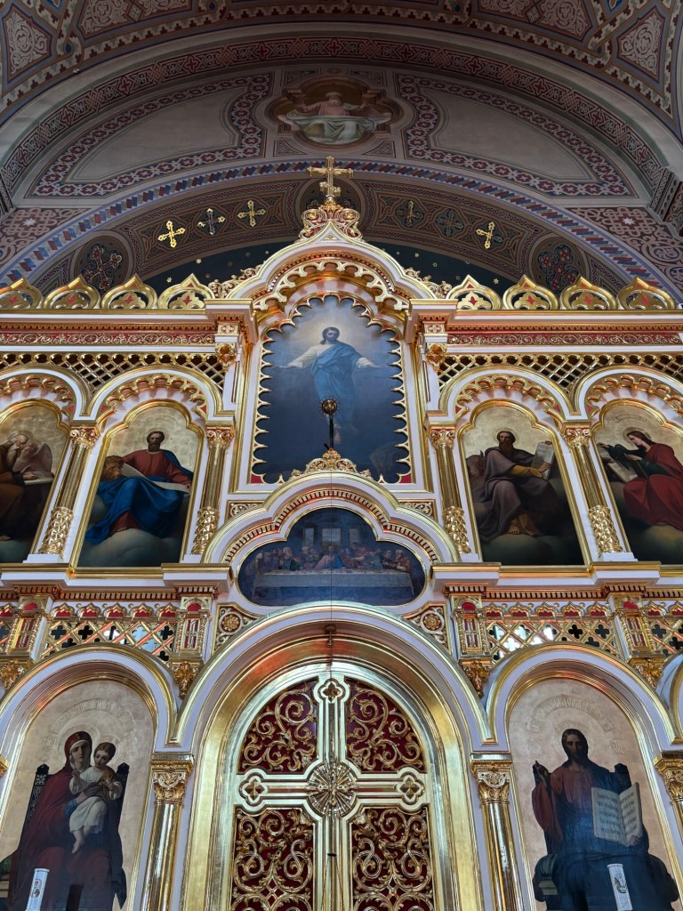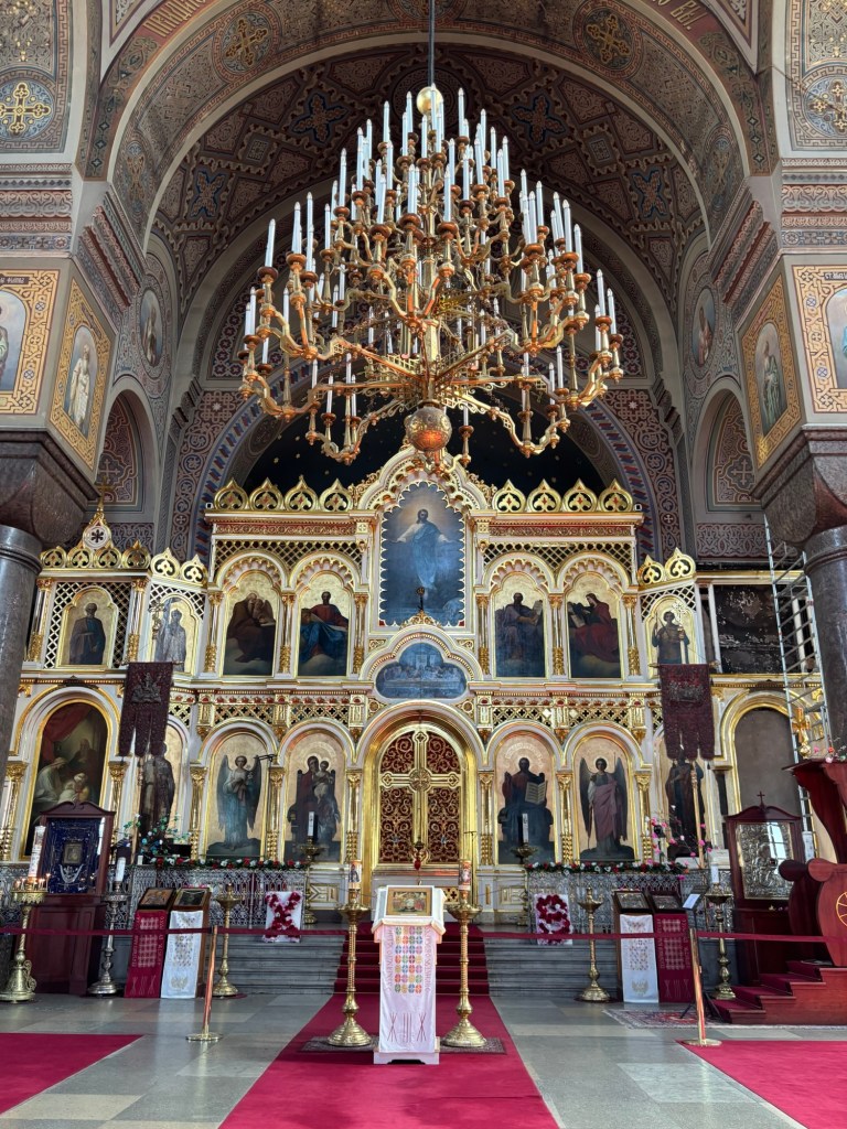 We continued on toward Uspenski Cathedral, a short walk to the harbor and a complete contrast in both aesthetic and opulence. Built in 1868, this red-brick Eastern Orthodox cathedral is the largest of its kind in Western Europe. Inside, gold icons glimmered in candlelight beneath its thirteen green domes, representing Christ and the twelve apostles. The interior was filled with grandeur and religious art. We spent a good amount of time walking in a circle around the sanctuary, pausing to take in the symbolic artwork at each station.