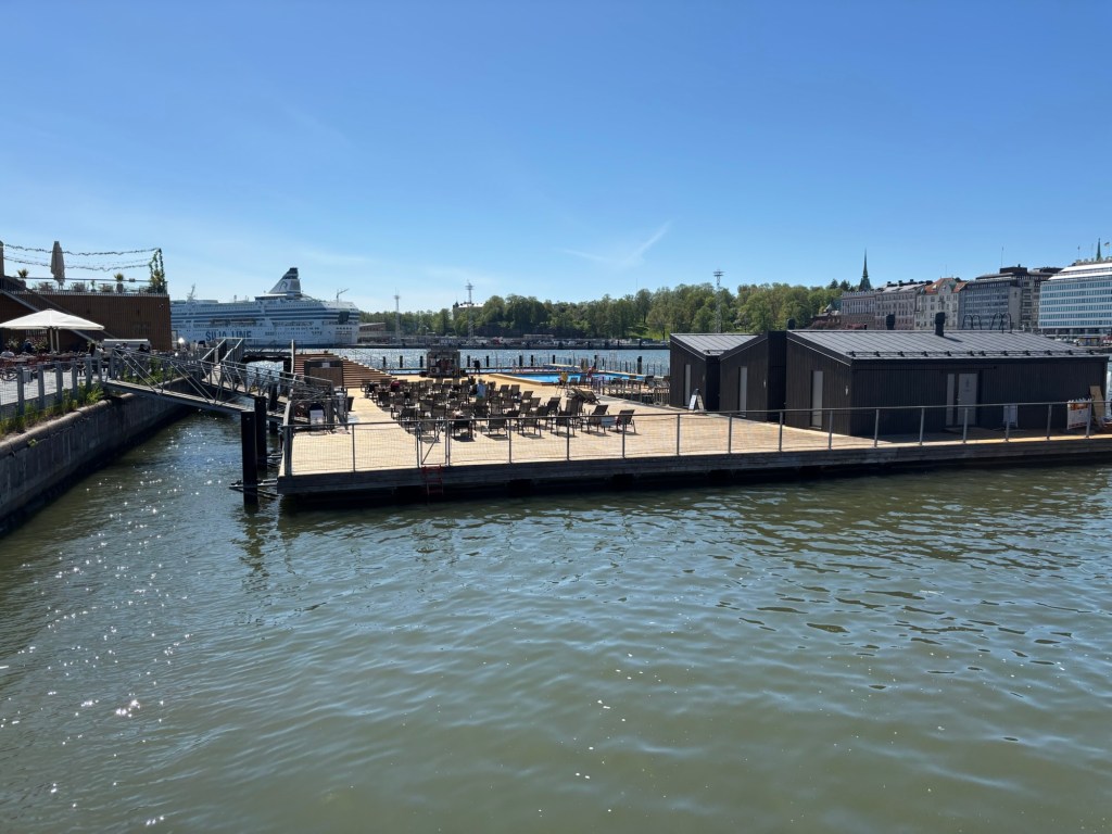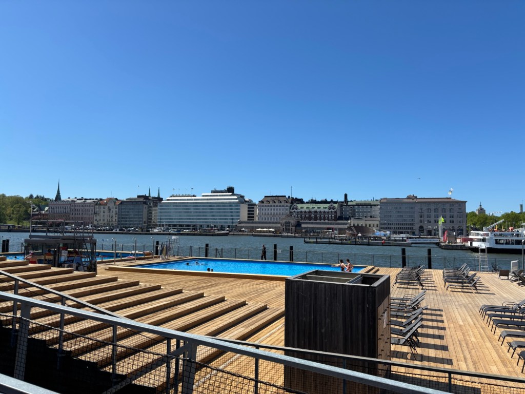 For lunch, we stopped outdoors at the Allas Sea Pool, where we sat bundled up while eating sandwiches and watched hardy Finns sunbathing in the sunny but brisk spring weather. Some dipped into the sea. Some swam in the pool. Others warmed themselves in the sauna before beginning the whole cycle again. There were even people in bikinis and swim trunks sitting with laptops and headphones, working remotely. We watched with a mix of admiration and awe, taking in the rhythm of Helsinki on a midweek spring day.