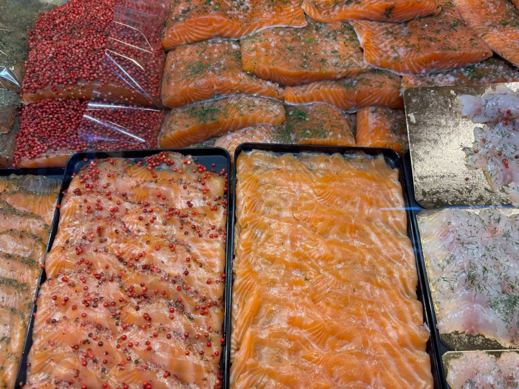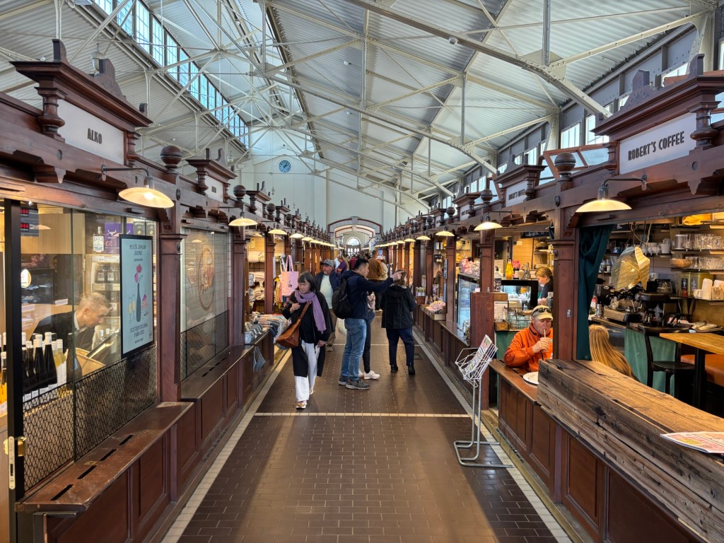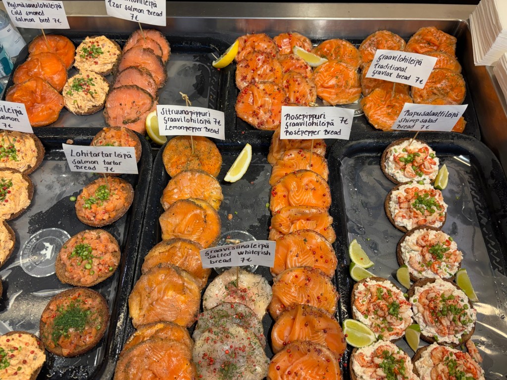After lunch, we wandered through the open-air harbor market looking for gifts, and then into the charming Old Market Hall, known as Vanha Kauppahalli. The stalls were a sensory overload of sights and smells: jars of cloudberry jam, stacks of smoked fish, reindeer jerky, handmade cheeses, and gleaming pink fillets of salmon. We sampled a few pastries and let the sugar carry us into the afternoon.