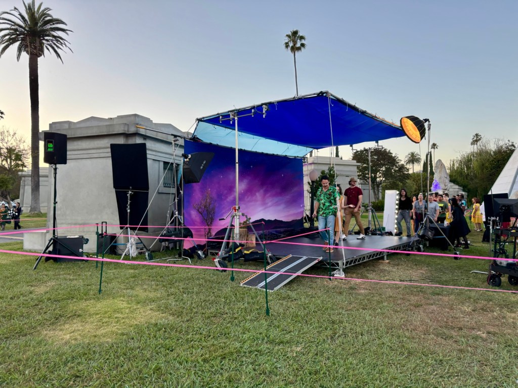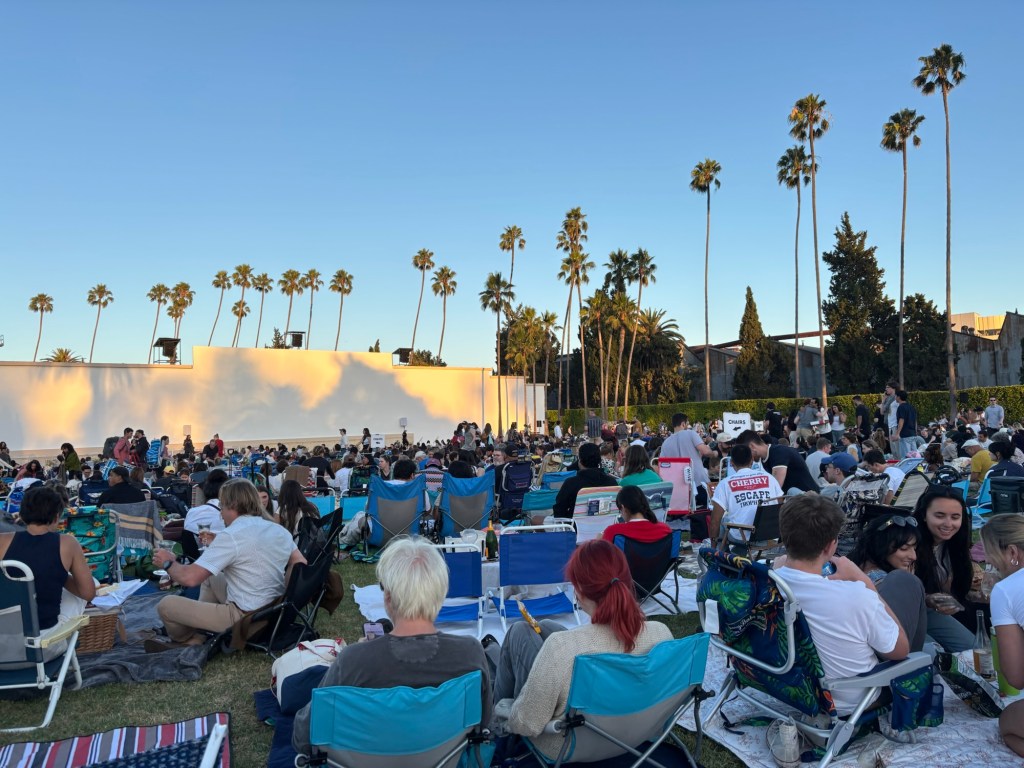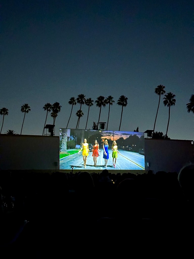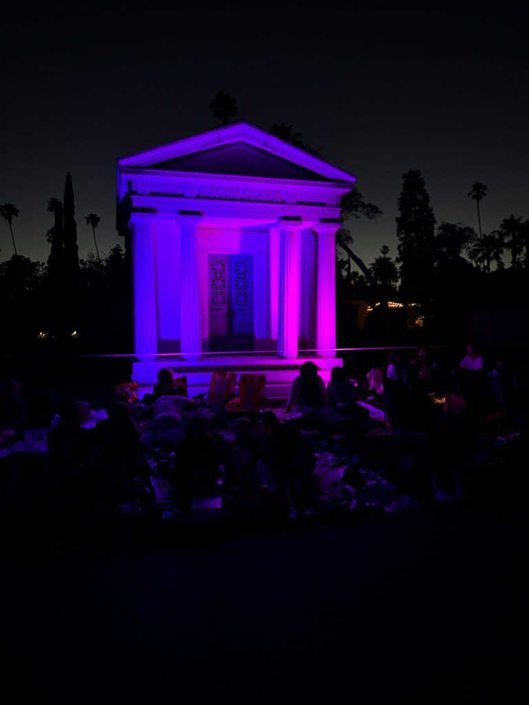 We were stretched across the Fairbanks Lawn with a few bottles of wine, a couple of pizzas, some bags of popcorn, and a few thousand of our soon-to-be closest friends around us for the collective experience of watching a movie in the Hollywood Forever Cemetery. And what movie could be more perfect to screen here than the 2016 award-winning film La La Land, flickering to life against a mausoleum wall silhouetted by tall, swaying palms and the outline of the Hollywood Hills.