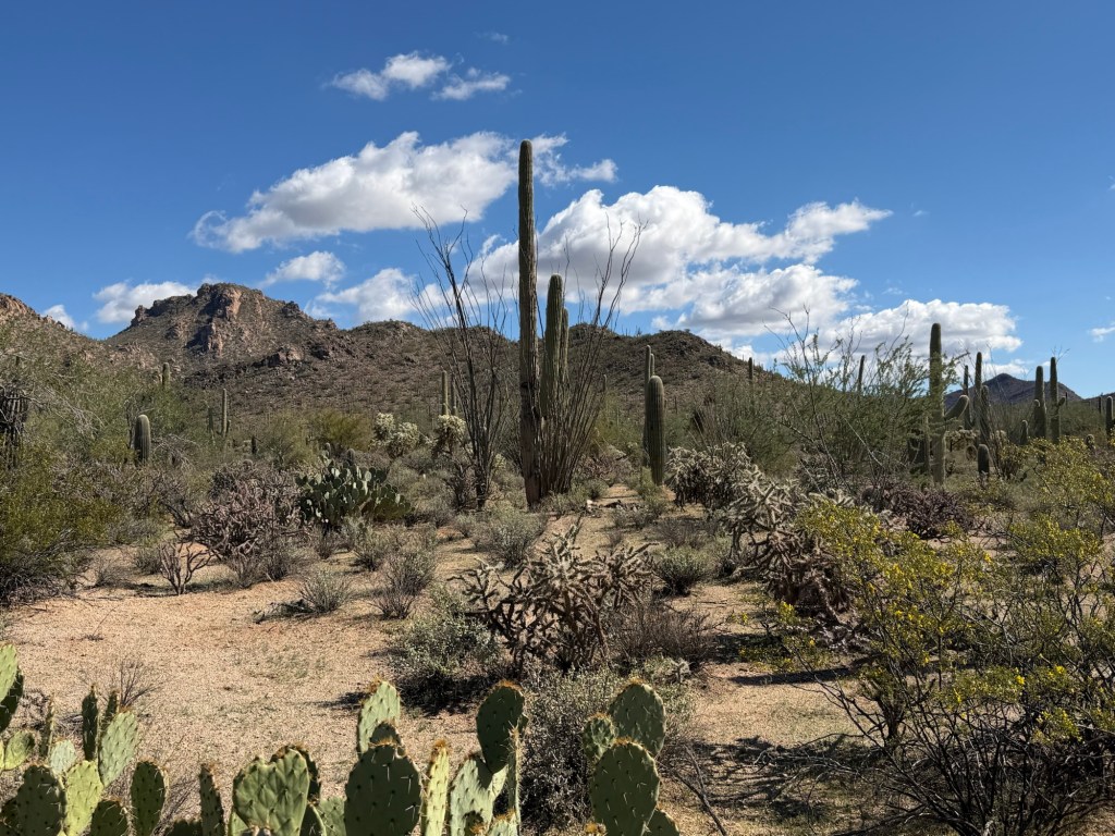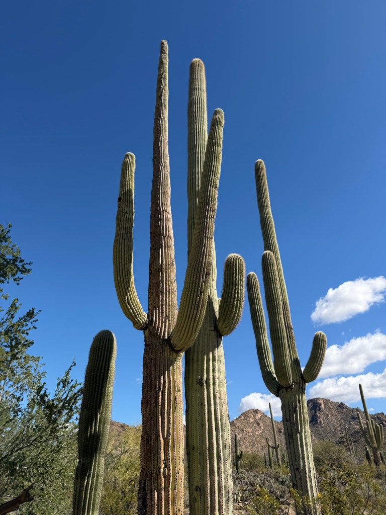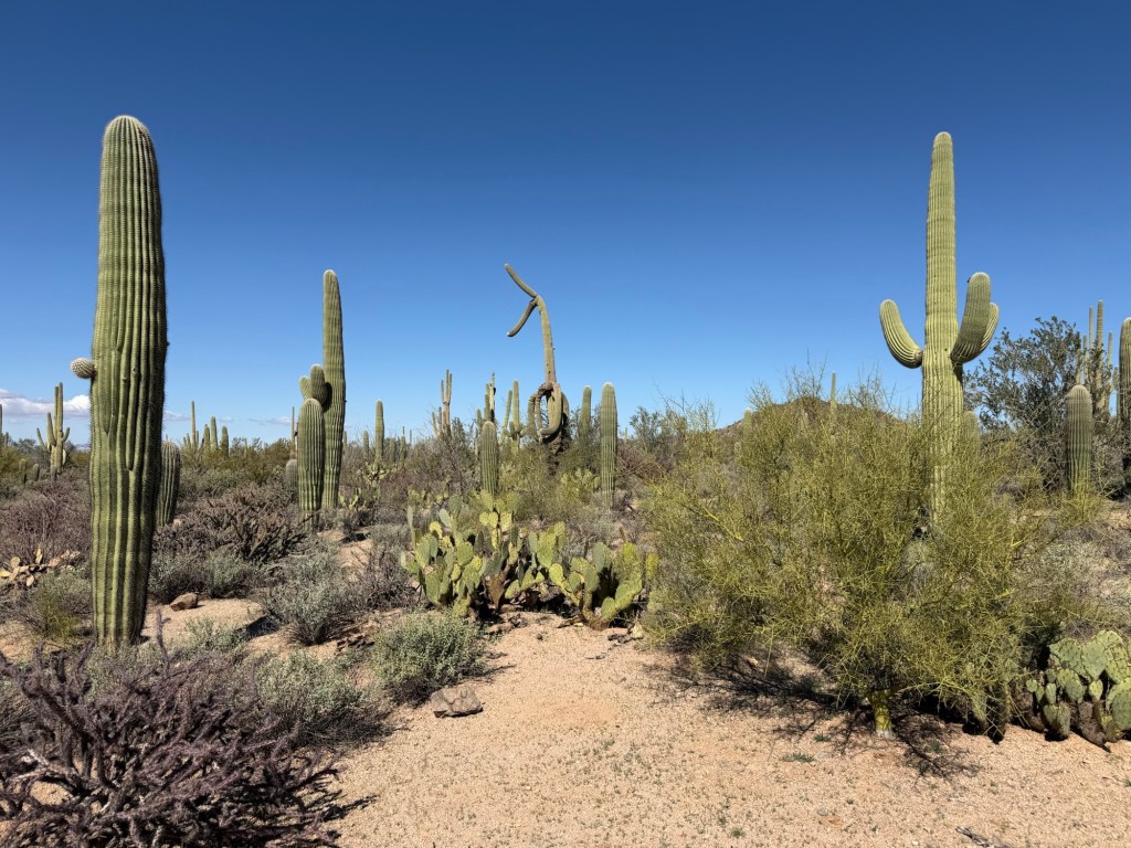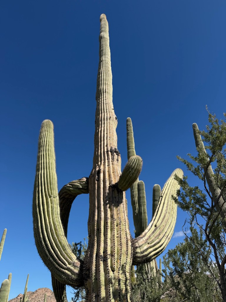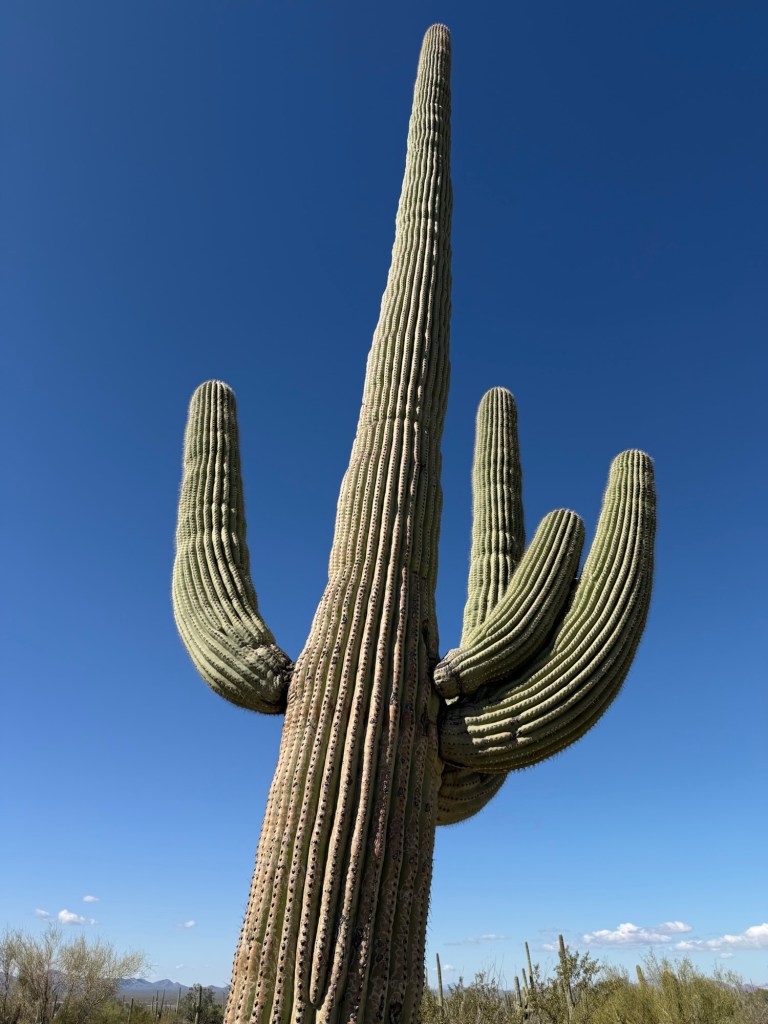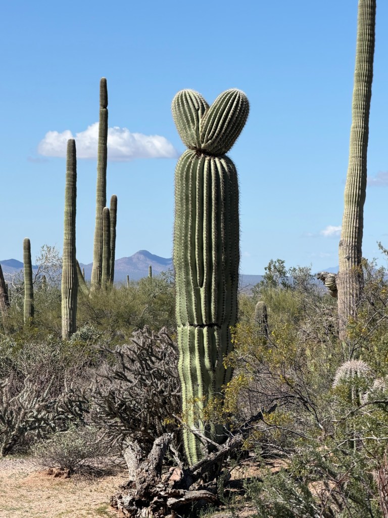 Some stand tall and straight like pillars. Others have begun to grow arms that stretch upward in the classic cactus pose that looks like the Taco Time NW logo. We later learned that saguaros spend decades simply growing taller before they begin branching. Many of the ones we saw were still young by desert standards.