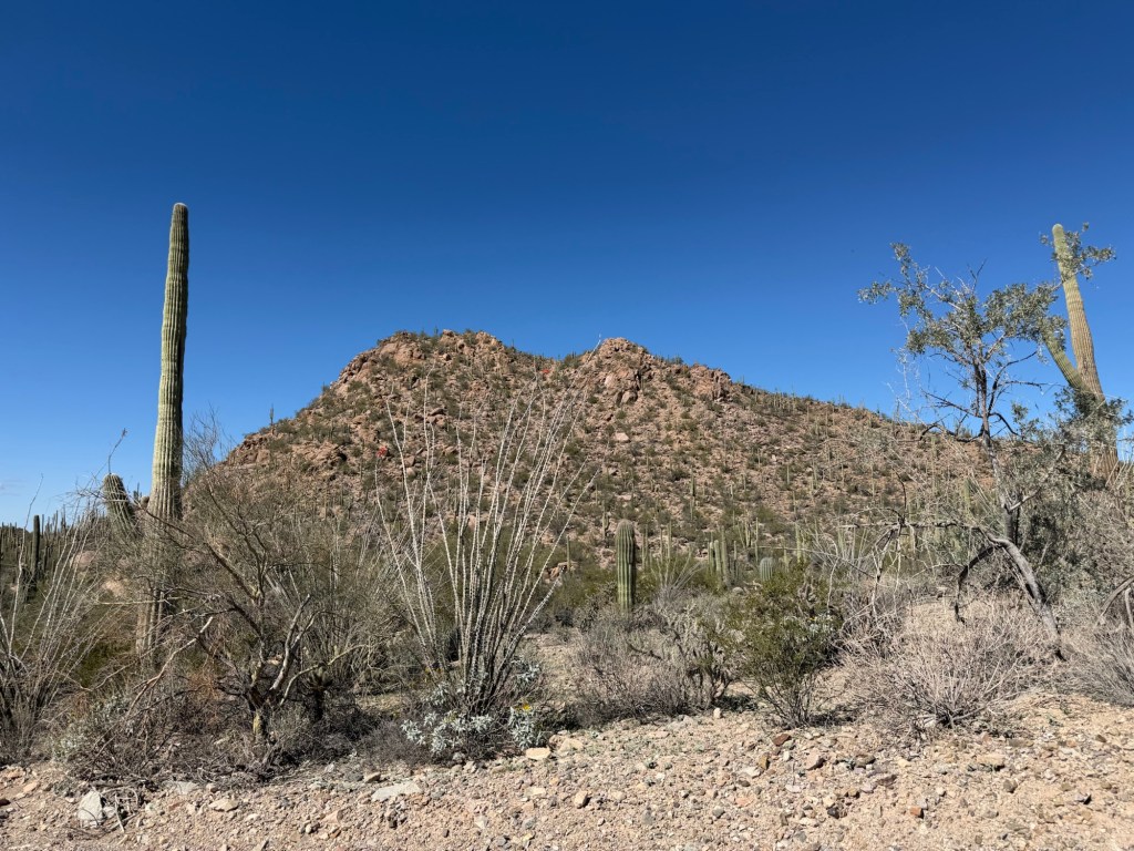 From there we drove the Scenic Bajada Loop Drive. It was more of a scenic drive than a hiking expedition because parking was scarce and several trailheads were closed due to aggressive bees, preventing us from seeing some petroglyphs. So we admired what we could from the road, which was plenty. Every bend revealed another hillside crowded with saguaros or fresh desert flowers blooming due to the recent rains. Hence the aggressive bees.